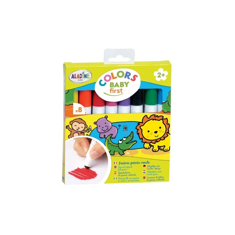 Colors Baby First : ses premiers feutres Avec les feutres Colors Baby First, Bébé a trouvé ses tout premiers feutres de coloriage ! Grâce à leur forme large, les petits sont parés pour apprendre à colorier et découvrir les couleurs. Pochette de 8 feutres – À partir de 2 ans La pointe plate et ronde de ces feutres permet un confort de coloriage pour les plus jeunes. Les pointes anti-enfoncement permettent de résister aux coups parfois brusques des enfants. Faciles et agréables à prendre en main, les enfants découvrent avec plaisir l?application de couleur et laissent libre cours à leur imagination. Aladine a pensé aux parents avec la gamme ?Colors Baby?, pas de problème quand on dépasse de la feuille : les encres sont lavables. Retrouvez dan