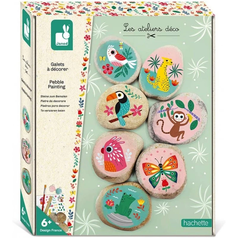 Envie d’évasion et de sable fin Et pourquoi pas apprendre à décorer ses propres galets comme on en trouve à la plage Les enfants dès 6 ans vont pouvoir se lancer comme des grands avec ce kit de création adapté à leur âge, s’appuyant sur les techniques de peinture et de transfert. Pour réaliser l’activité, rien de plus simple : il suffit de peindre son galet d’une couleur au choix (vert ou rose) puis de poser le dessin à transférer dessus et de frotter avec le bâtonnet en bois pour voir le motif imprimé sur le galet ! Les illustrations et couleurs très délicates permettent un rendu tout en douceur qui invite à la rêverie. Cette activité est idéale pour apprendre patience et concentration, et développer la motricité fine en incitant l’enf