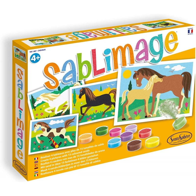 Épatant ! Cette gamme d?activité artistique a été conçue pour que de très jeunes enfants puissent réaliser de jolis tableaux naïfs sans se salir. Pour cela, il suffit de décoller les surfaces préencollées et de les saupoudrer avec les différents sables proposés. Une activité ludique et artistique idéale pour développer la créativité, l?habileté manuelle et le sens des couleurs. Avertissement De Sûreté Ne convient pas a des enfants de moins de 36 mois.Contient de petits elements pouvant etre inhales ou avales. Contenu du coffret Plus de 15 petits pots de sables 4 tableaux (6 pour les réf. 892 et 894) 1 petit couteau pour décoller le double-face 1 notice